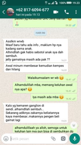 Salah satu cara mengobati dan menyembuhkan ganglion secara alami yang sudah terbukti ampuh dan efektif ialah dengan menggunakan QnC Jelly Gamat, obat ganglion alami yang terbuat dari ekstrak teripang emas. Berbagai kandungan yang ada didalamnya sangat berkhasiat tinggi dan memiliki manfaat untuk mengobati berbagai macam penyakit salah satunya penyakit ganglion.